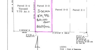 Each parcel, 5 acres $79,995 with $12,000 down and $695/month.
